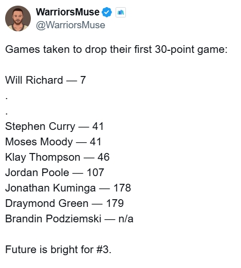 Đây cũng là trận đấu thứ bảy trong sự nghiệp của anh. Để so sánh, Curry và Moody đều ghi được 30+ đầu tiên trong trận đấu thứ 41 trong sự nghiệp tương ứng của họ; Clay's là thứ 46, và Poole là thứ 107;