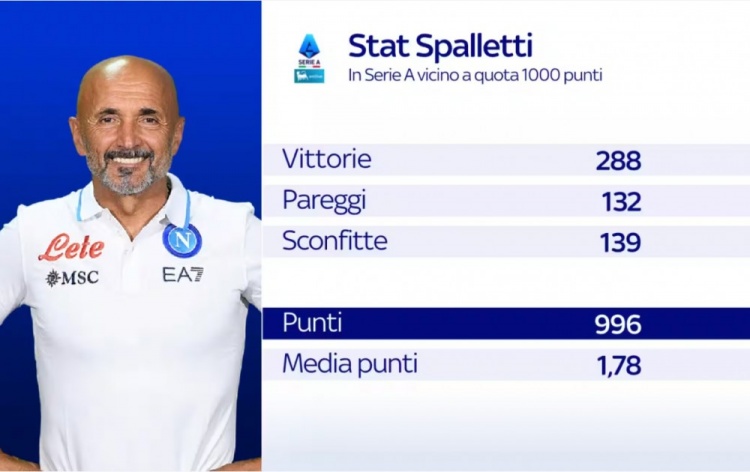 Thống kê cho thấy Spalletti đã giành được tổng cộng 288 trận thắng, 132 trận hòa và 139 trận thua ở Serie A, với tổng cộng 996 điểm và trung bình 1,78 điểm mỗi trận.