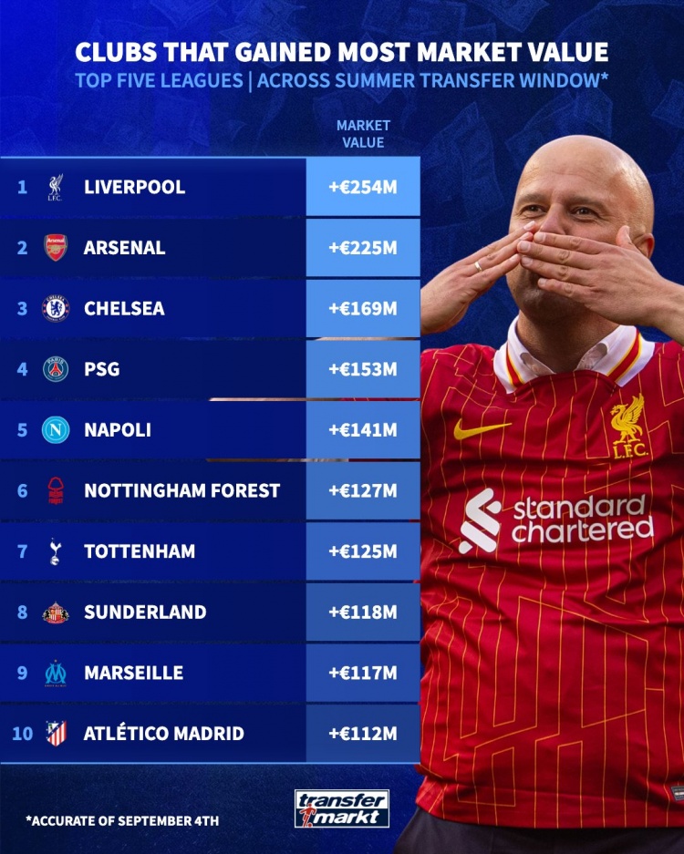 Không đăng lại mà không được phép:FjoNews » Danh sách tăng giá trị ròng của nhóm sau cửa sổ mùa hè: Liverpool + 254 triệu euro xếp thứ nhất, Pháo thủ thứ hai, Blues thứ ba