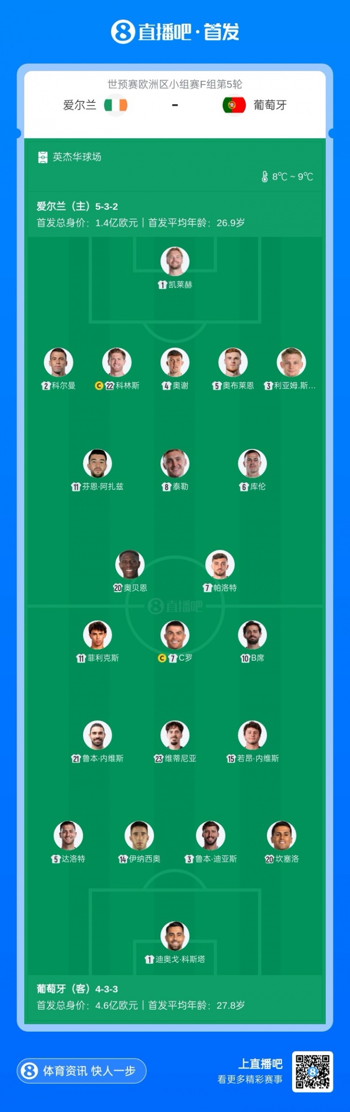 Ở vòng thứ năm của Bảng F thuộc Vòng bảng Châu Âu của Vòng loại World Cup, Ireland đối đầu với Bồ Đào Nha trên sân nhà. Đội hình xuất phát đã được công bố trước trận đấu. Chỉ cần Bồ Đào Nha thắng trận này, họ sẽ giữ vững ngôi đầu bảng và tiến tới World Cup.