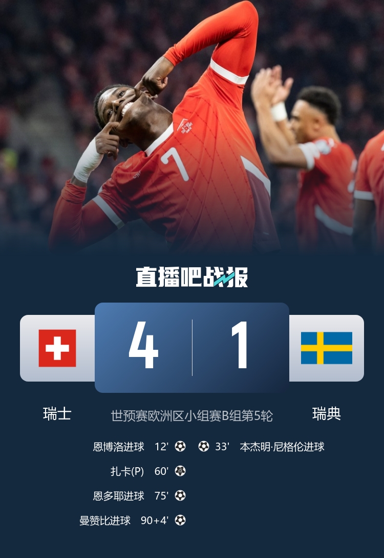 Thụy Sĩ 4-1, Thụy Điển sắp lọt vào Hoa Kỳ, Canada và Mexico. Xhaka sút đường chuyền của Ndoye. Thụy Điển đang đứng cuối bảng khi không thắng nổi sau 5 vòng đấu.