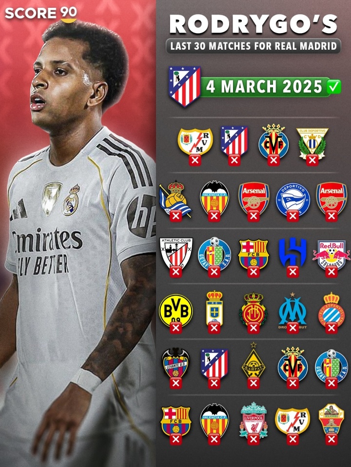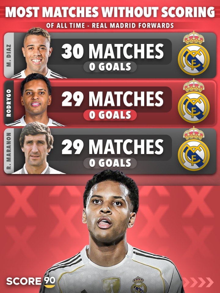 Tiền đạo Rodrygo của Real Madrid đang ở trong tình trạng ì ạch trong mùa giải này, chơi 14 trận mà không ghi được một bàn thắng nào. Hiện tại, CLB của Rodrygo đang có chuỗi 29 trận hạn hán bàn thắng liên tiếp, đứng thứ 2 trong lịch sử Real Madrid, chỉ đứng sau Mariano, người có 30 trận hạn hán bàn thắng. Lần gần nhất Rodrigo ghi bàn cho Real Madrid là vào lưới Atletico Madrid vào tháng 3 năm nay.