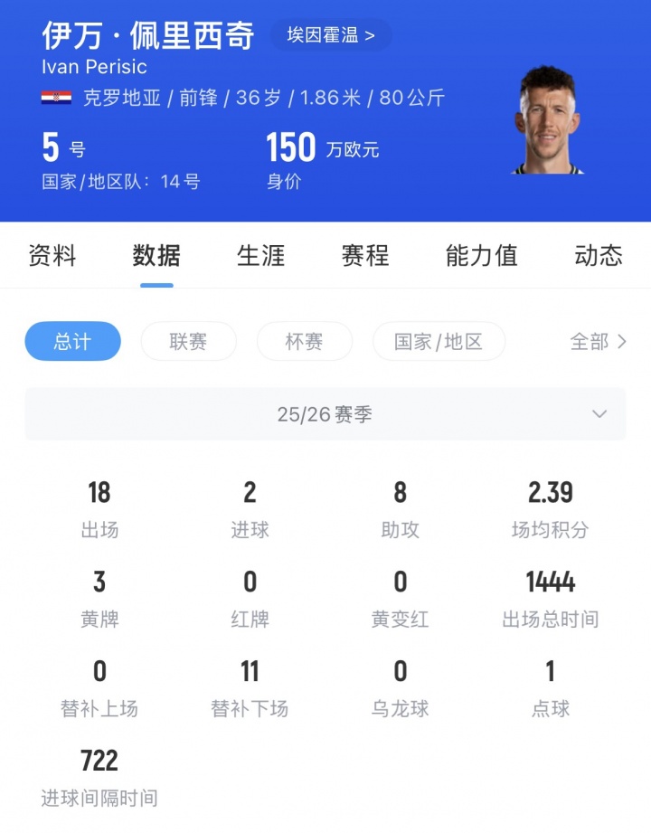 Perisic đã ra sân 18 lần cho PSV mùa này và đóng góp 2 bàn thắng cùng 8 đường kiến tạo.