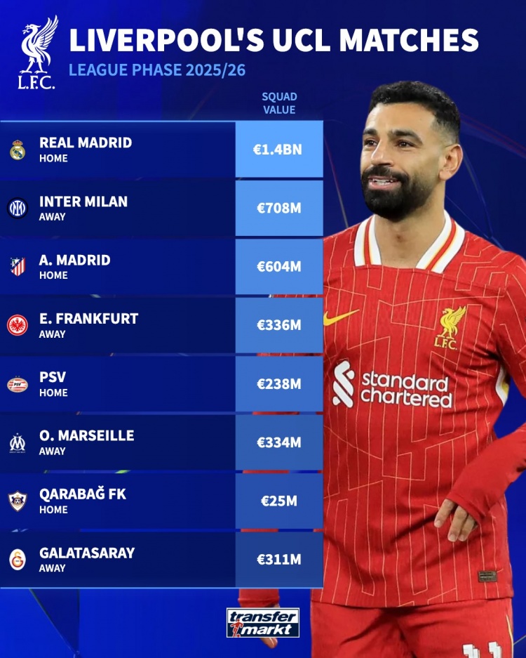 Giá trị đối thủ Champions League của Liverpool mùa này: